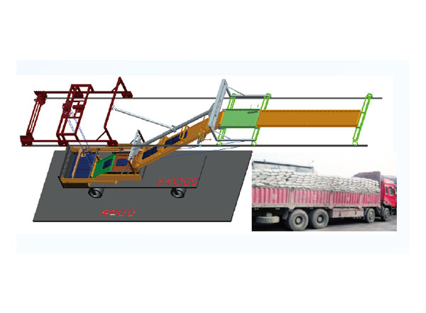 自动装车机(Ⅱ型)是针对车宽2.0-2.6m有车板的货车自动装车,水泥包以皮带输送机上的同一种方向,在自动推板的作用下分别推向两侧的车板并平行摆放,通过抽板完成下一层的堆垛功能。
